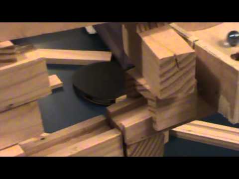 This is a great wooden marble run which appears to be handmade. Unfortunately it's not in English so I'm not sure what they're saying.